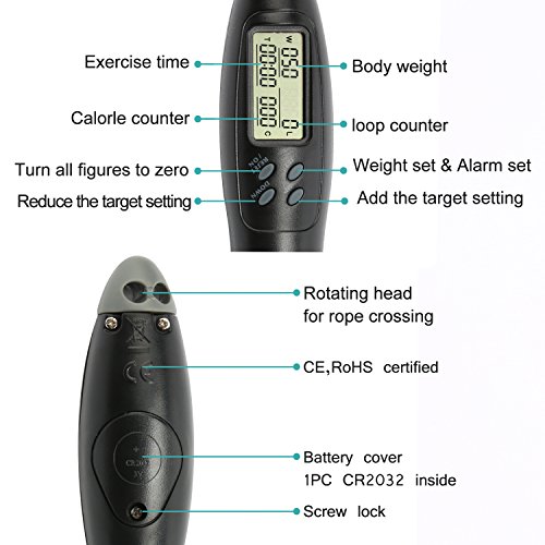 - Feature : Save space, jump rope without the rope. Wireless skipping does not occupy space anywhere off, so you can jump and jump and jump without getting tangle up in the rope, making your exercises more convenient and interesting. / This is fully adjustable. There are gray clips at the end of handle that hold the rope in place, just loosen the rope from the clips and shorten it as you like. / Fashionble design with big LCD display. Designed with a Timer, Calorie Counter, and Jumping Counter,it is accurate and easy to reset. assist you to burn fat,lost weight,beauty body and keep healthy. / Portable and compact. So you can throw it down in your gym bag,lunch bay and take it anywhere you go.Material: Handle:ABS+Rubber, Rope:PVC,anti-slip soft silicone, EVA foam and counterweight iron. / Suitable for young, old,adult and children, no age limitation. Enhance children's growth and improve their intelligence.