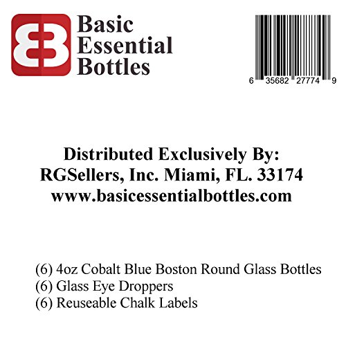 (6) 4 oz Empty Cobalt Blue Glass Bottles W/Glass Eye Droppers and (6) Chalk Labels for Essential Oils, Aromatherapy