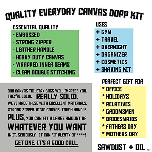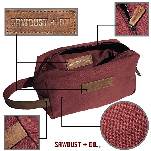 - QUALITY SELECTION and CLASSIC STYLE - Pick an Incredible Design and Color. CHARCOAL GRAY, NAVY BLUE, or MAROON RED. Our Sawdust + Oil Design Team has Brought You the Perfect Toiletry Bag in Stunning Canvas and Leather. Each Travel Bag is Embossed with the Sawdust + Oil Logo on the inside and out. We Stand for Hard Work from the Land (Sawdust) and the Mechanical (Oil), We're Here to See It Through 'Til the End. Tough. Rugged. Durable. And Dependable. That's Sawdust + Oil.