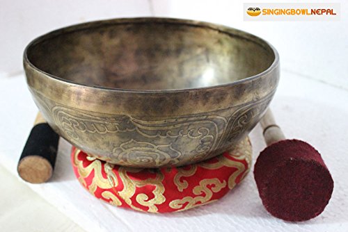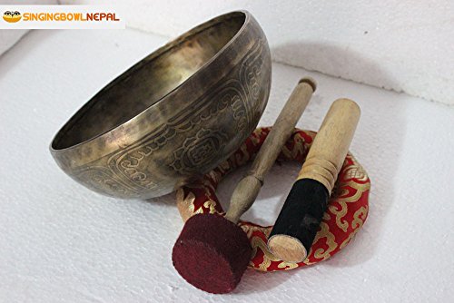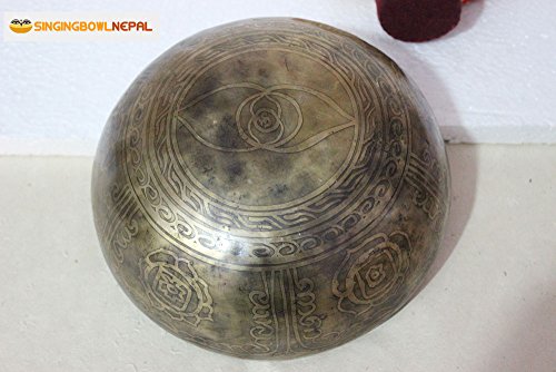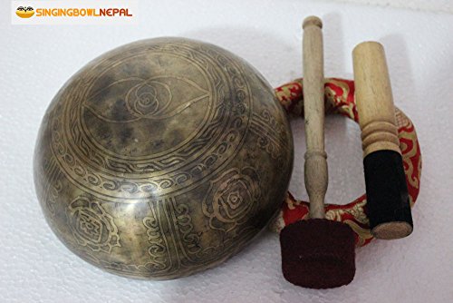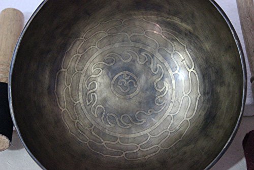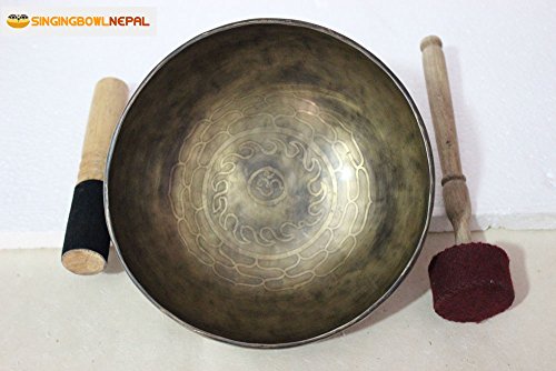 Studio : Singing Bowl Nepal Publisher : Singing Bowl Nepal Product Description Mantra Carved 9" Himalayan Singing Bowl is a special bowl, which is made of seven metals, i.e. gold, silver, copper, iron, tin, lead, and zinc. All the metal used has a specific purpose and represent the sun and the moon and other planets. This bowl can be used for meditation, music, and chakra cleansing. A leather striker is included with this singing bowl and this bowl was hand-hammered in Nepal. This bowl is truly hand made in a traditional way at singing-bowl house .Due to handmade bowl,the surface have several marked of hammered on it. The bowl have long lasting tune which create totally peaceful environment around you . who are looking for real handmade bowl from Himalaya will not be disappointing by this bowl.