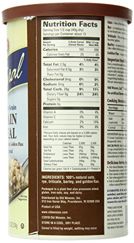 -. Feature : A mix of oats, rye, triticale, barley, and golden flax that's an especially good vegetarian source of omega 3's / Delicious hot cereal / Wheat free / Pack of twelve, each pack holds 18.5 ounce (total of 222 ounce) / Hot Cereals may reduce the risk of heart disease / Free of sugar, salt, cholesterol, additives and preservatives / All natural and 100% whole grain / Packaged in a plant that also processes wheat, gluten, tree nuts, soy and dairy
