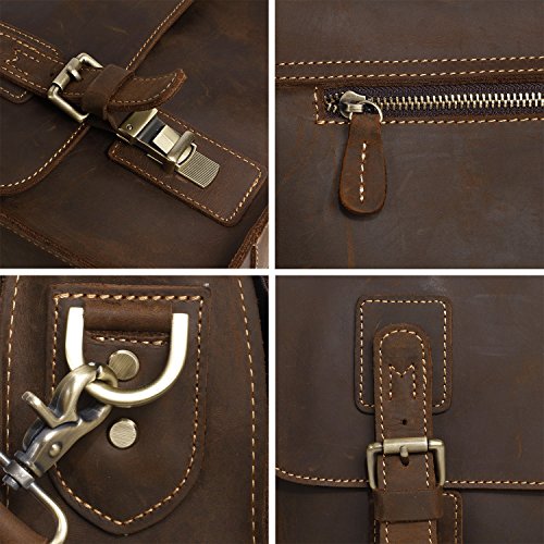 -. Feature : Made of Crazy-Horse Genuine Cow Leather, 100% Brand New & High Quality / Top zipper closure and front flap buckles closure which is great for quick-access items / Interior with compartment pocket can store your 16" Tablet PC, A4 magazine, portable textbooks, clothing, ect; Back wall zipper pocket, wallet holder, cell phone holder and two pen holders; Back exterior with zipper pocket can also store your IPAD / Adjustable full leather shoulder strap with detachable brass hardware buckles / Classical style, General use for business or travelling, can be used as laptop bag, briefcase handbag, messenger bag