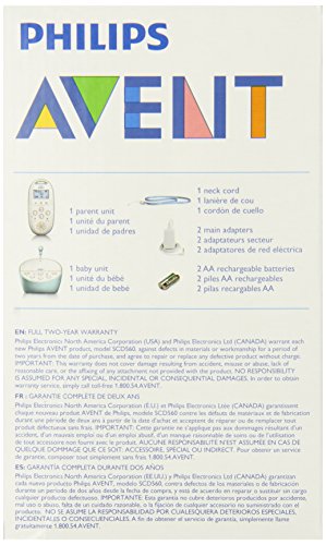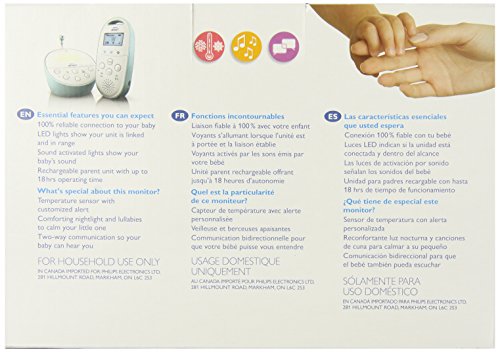 -. Binding : Baby Product -. Brand : Philips AVENT -. Color : White/Blue -. Department : baby-boys -. EAN : 7288577573483 -. Feature : A secure P.R.Ivate connection to your baby with DECT technology that guarantees zero interference, clear souund, with range up to 900 feet / Comfort your little one with the talkback feature, a night light or lullabies, while monitoring the temperature in the room / Parent unit is outlet or battery powered / Talk back feature to stay connected / Range up to 330 meters / Zero interference and P.R.Ivate connection: DECT technology guarantees zero interference and 100% P.R.Ivacy / Customized temperature sensor / Night light and lullabies / Talk back feature / Range of up to 330 meters -. IsAdultProduct : 0 -. Label : Philips AVENT -. Manufacturer : Philips AVENT -. Model : SCD560/10 -. MPN : SCD560/10 -. PackageQuantity : 1 -. PartNumber : SCD560/10 -. ProductGroup : Baby Product -. ProductTypeName : BABY_PRODUCT -. Publisher : Philips AVENT -. ReleaseDate : 2013-08-27 -. Studio : Philips AVENT -. Title : Philips Avent DECT Baby Monitor with Temperature Sensor -. UPC : 075020031679