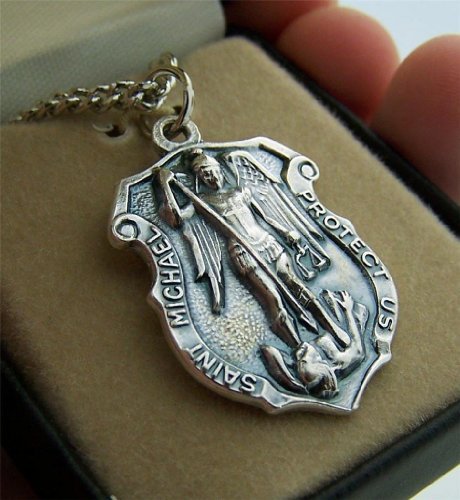 Silver Toned Base Police Patron Saint Michael Shield Shaped Medal, 1 1/4 Inch