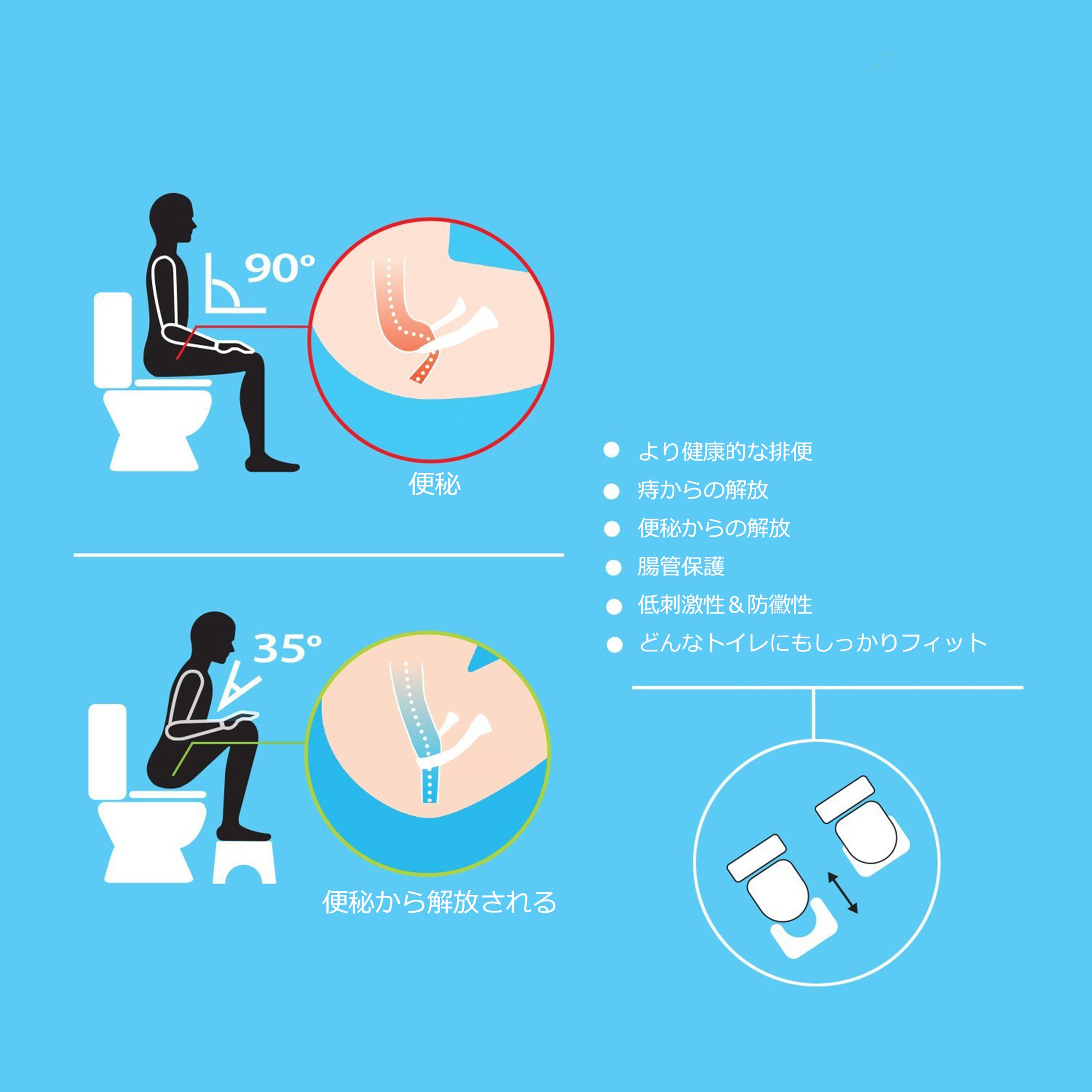Using toilet stepping stones makes it possible to make natural "angle of 35 degrees", which is said to be the best for excretion by raising their feet, and the puborectal muscles relax, making excretion smoother.