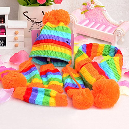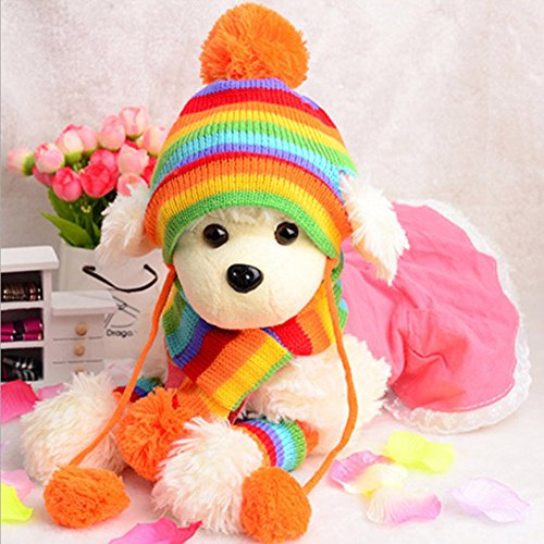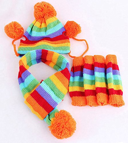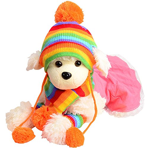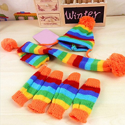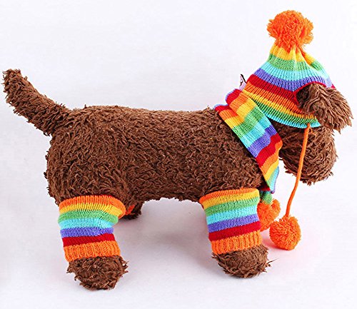 -. Binding : Misc. -. Brand : C-Pioneer -. Color : Rainbow -. Feature : Hand-woven rainbow hat scarf three-piece sets of gloves, large wool ball paste the dog's lovely nature / Warm and lovely can also protect the hair and fur health / A very cute costume for your pet, dog, cat, etc. / Perfect for keeping your dog in style and staying warm as well. / It is also an excellent gift for dogs and dog lovers -. Label : C-Pioneer -. Manufacturer : C-Pioneer -. PackageQuantity : 6 -. ProductGroup : Pet Products -. ProductTypeName : PET_SUPPLIES -. Publisher : C-Pioneer -. Studio : C-Pioneer -. Title : C-Pioneer 6PCS/Set Dog Pet Puppy Winter Warm Hats Scarf Leg Warmer Pet Clothes Hat+Scarf+Socks Set