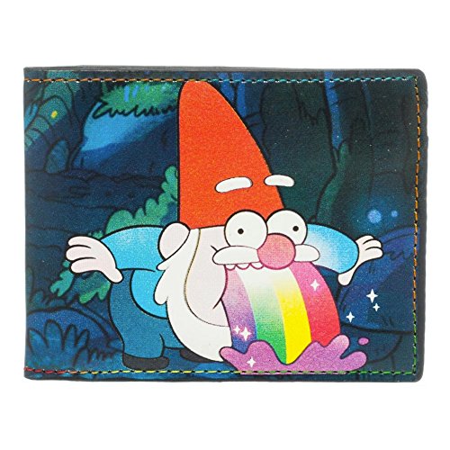 Product DescriptionThis bifold wallet features the barfing gnome from the show Gravity Falls.This wallet can hold approximately 3-5 credit cards, an ID, and cash.0