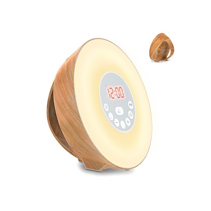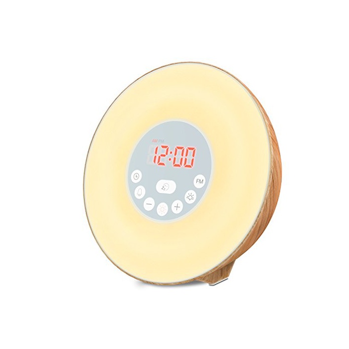【나무결광+음자명종】COULAX Wake Up Light 아사히 모의광 자명종 웨이구앗푸라이토 FM라디오 기능 베드 싸이드 램프 광도 조절다 색변환 led 시계 테이블 라이트