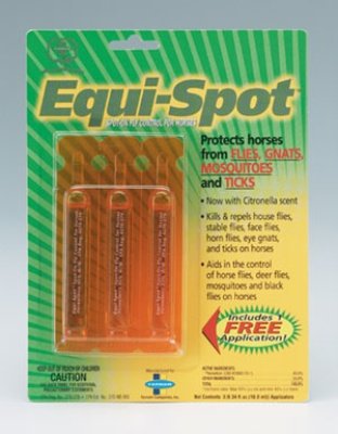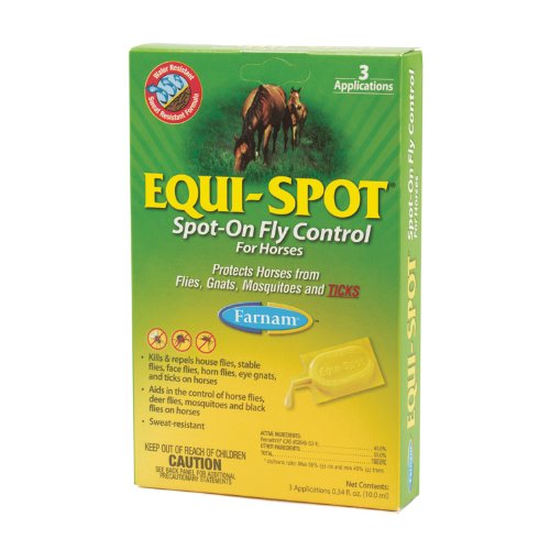 Product Description Spot-on fly control for horses. Kills and repels house flies, stable flies, horn flies, eye gnats, and ticks. Helps control horse flies, deer flies, mosquitoes and black flies (3 tubes to a pack)/don t let product get in eyes, or muco. Do not use on horses under 12 weeks of age. Usage:1 tube(10.0ml) . Ml along back line to base of tail.