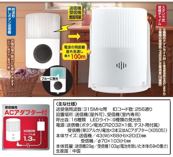 ボタンを押すと、離れた場所へ光とチャイムでお知らせ。受信機は、暗い場所でナイトライトになります。(ナイトライトはACアダプター使用時のみ) |