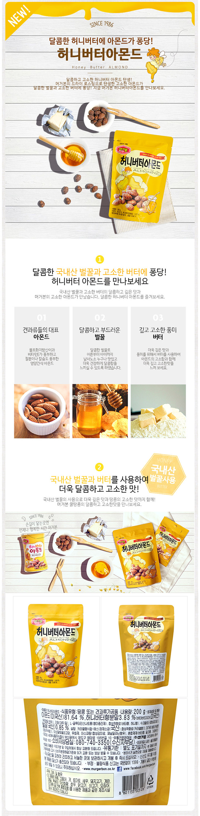 アーモンド(81.64%)、蜂蜜バターの香り粉末(3.83%)、ボルクク、砂糖。