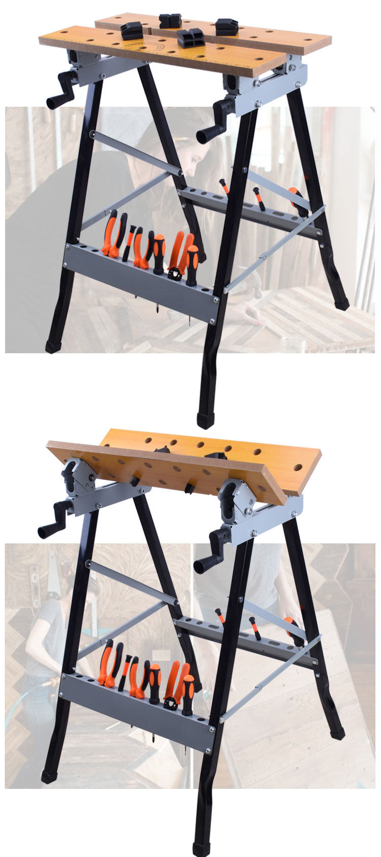 1. Multifunctional, folding, carpentry workbench, tool table.