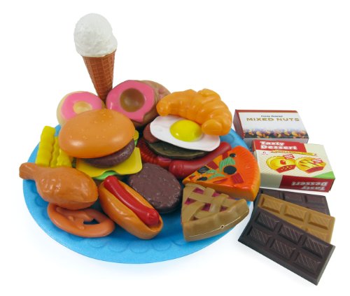 -. Feature : Fast Food & Dessert Play food Assortment (30 pieces) / Fast Food include: pizza, cheeseburger, french fries, hot dog, sausage, egg, chicken, meats, and more! / Desserts include: donuts, ice cream, cookies, croissant, pastry, pretzel, pie, fruit cake, nuts, chocolate, and more! / The perfect accessory to enhance playtime experiences / Great addition to any Kitchen or playhouse