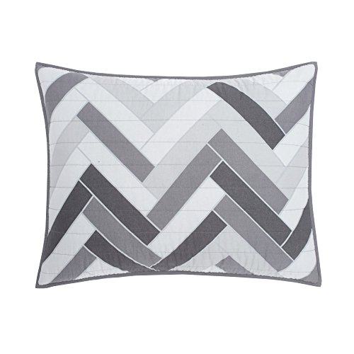 - Bold lines in alternating shades of grey zig-zag across the face of the quilt