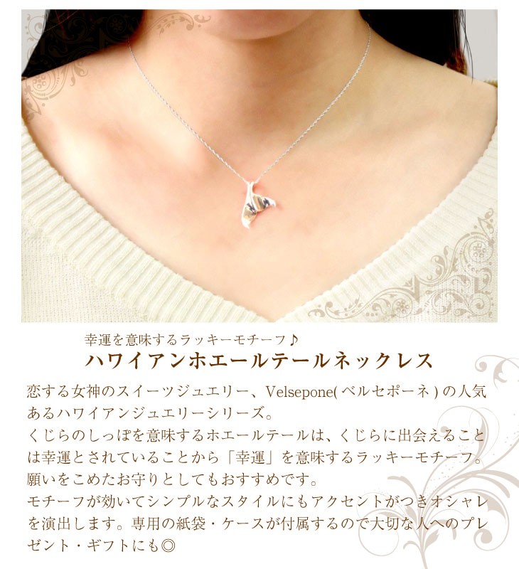 恋する女神のスイーツジュエリー、Velsepone(ベルセポーネ)の人気あるハワイアンジュエリーシリーズくじらのしっぽを意味するホエールテールは、 くじらに出会えることは幸運とされていることから「幸運」を意味するラッキーモチーフ。願いをこめたお守りとしてもおすすめです。モチーフが効いてシンプルなスタイルにもアクセントがつきオシャレを演出します。専用の紙袋・ケースが付属するので大切な人へのプレゼント・ギフトにも◎サイズ 23mmx14mm/チェーン40cm素材 シルバー925付属品 専用BOX、ショッパー