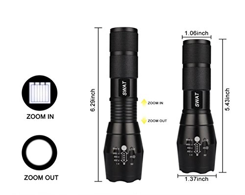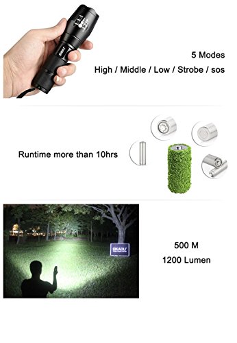 - XM-L T6 LED Zoom Flashlight >2000 Lumen) Super brightest :A set of Five high performance LED bulbs deliver 2000 lumen to give you the brightest illumination up to 100,000 hours,Whether you're out in the woods,Camping, Military Exercises ,Working in your Basement,or Stuck in the way OF an EMERGENCY