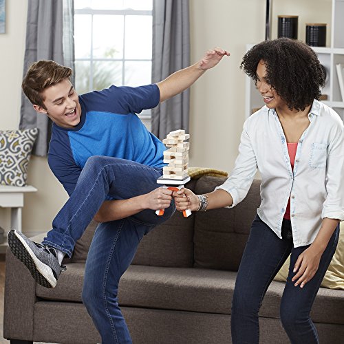 Take the classic Jenga game "off the table" with the Jenga Pass Challenge game. Stack Jenga wooden blocks on the platform to build the tower then remove one block at a time while holding one of the platform handles. It takes a steady hand when removing the blocks and passing the platform to opponents…be carefull or the Jenga tower will come crashing down! Be the last player to successfully stack a block and pass the platform without causing the tower to crash. The platform has two handles and comes with a stabilizing stand. Enhance gameplay and try all 10 challenges included in the game guide, such as Blind Block, Chopstick Challenge, and Flamingo Fumble.Feature