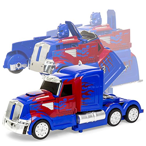 Gift your child with the perfect 2-in-1 action toy. Just one push of a button, and your child can watch it transform from a robot to a semi-truck in seconds! This transformation robot can get down with 2 dance modes and music, and the included sword and shield completes its tough, crime-fighter design. Keeping kids busy for hours, this truck is sure to transform playtime. SPECIFICATIONS: Package Dimensions: 18"(L) x 8.75"(W) x 7.5"(H) Car Dimensions: 13.5"(L) x 4.75"(W) x 6"(H) Robot Dimensions: 8.5"(L) x 8"(W) x 10.5"(H) Remote Dimensions: 5"(L) x 2"(W) x 4"(H) Weight: 3.3 lbs. Color: Blue Material: Plastic Battery Type: 4.8V 700mA NiCd Batteries Necessary: (2) 1.5V AA (not included) Remote Frequency: 27MHz Charger Type: USB Charge Time: 2 hours Max Speed: 4.5 mph Max Controller Distance: 20 meters Recommended Ages: 8 years+ No assembly requiredFeature