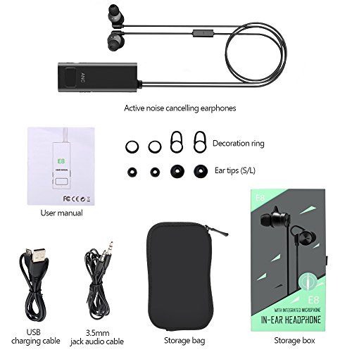 1X E8 active noise cancelling headphones 1X Storage bag 1X micro USB charging cable 1X user manual 1X 3.5mm jack audio cable 4X Silicone Ear cap (L,S) 2X decoration ring