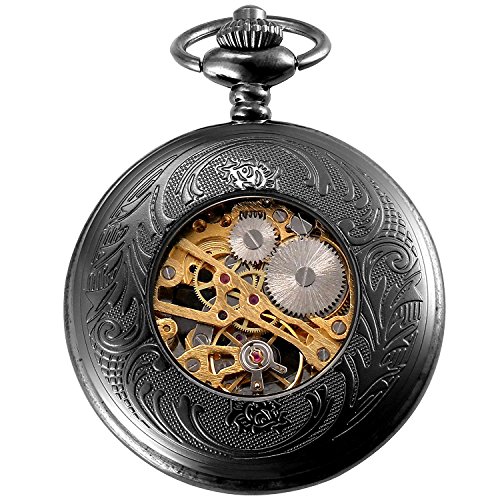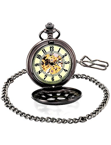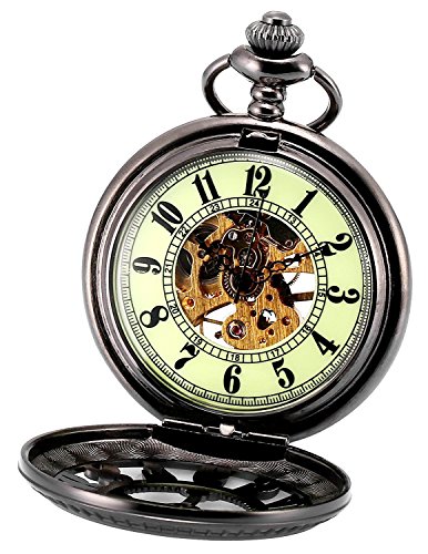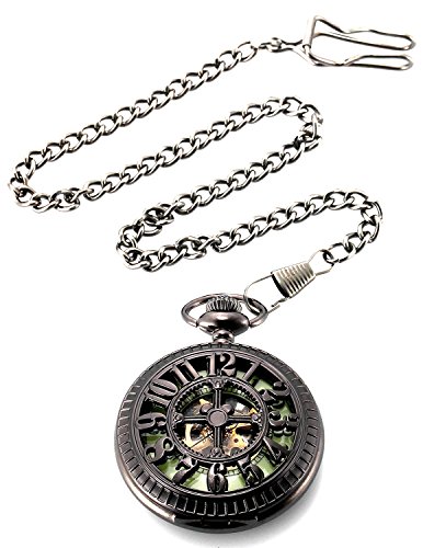 -. Feature : Retro mechanical pocket watch with a black tone metal chain, Skeleton dial design reveals your fashionable point of view,Mechanical hand wind movement with analog display / High quality gives you a new classic definition. / Best gift to your lover, Partner, family, friends, classmates, colleagues Xmas gift / Skeleton See Through Luminous Watch Dial, Black Watch Case Match the Luminous Dial / Comes with pocket watch gift box + Chains
