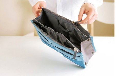 -. Feature : Perfect for holding cosmetics, cell phone, cards, pens, keys, purse, make-up and other essential items / Material: Nylon / 1 large pockets, 4 small pockets, 2 zipper pocket and 5 mesh pockets / Easily move and rotate the entire contents of your bag / Dimensions (L x W x H): 11" x 6.5" x 0.5"