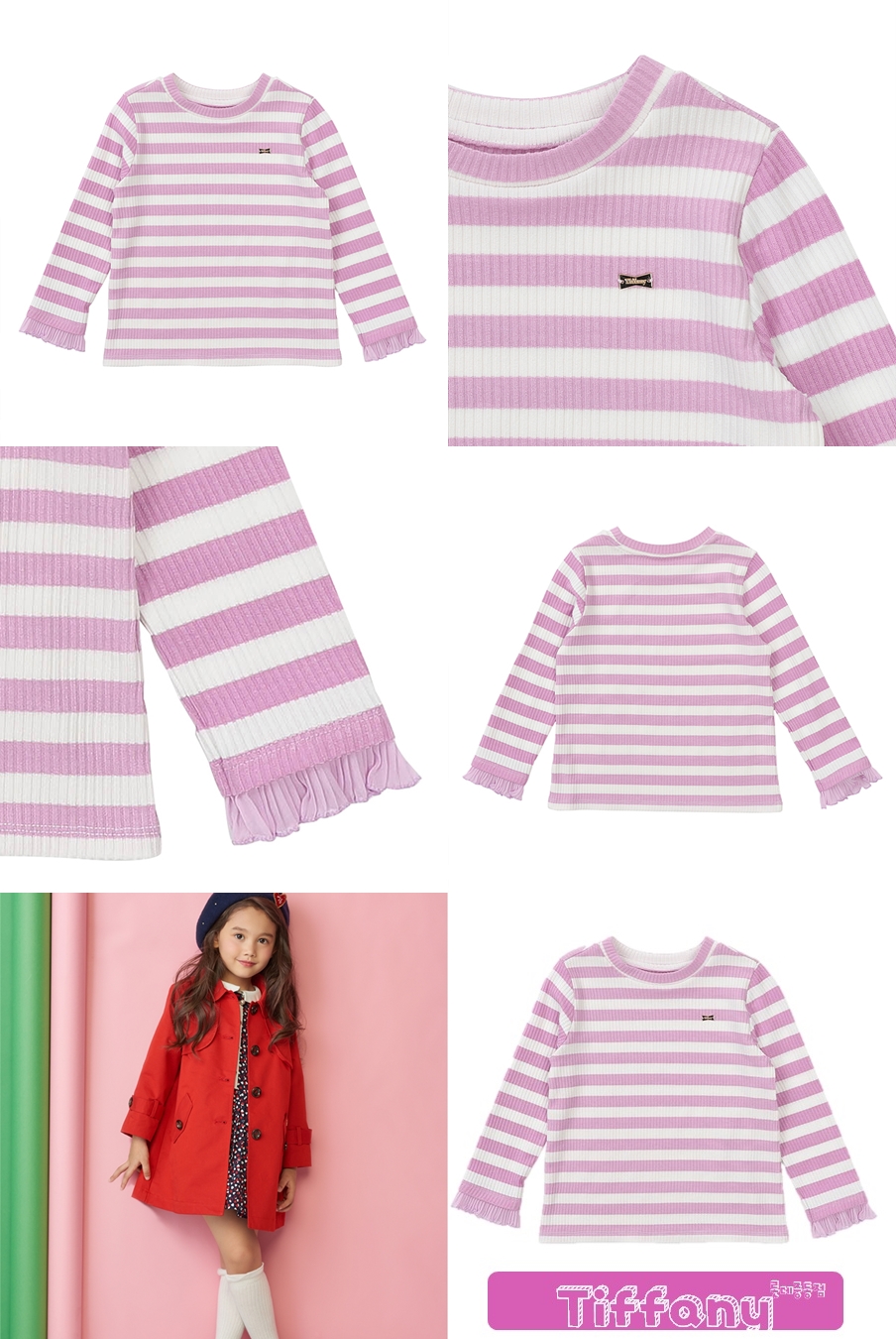 연보라 골지 스트라이프 티셔츠로 소맷단에 주름쉬폰지를 배색으로 덧대어 포인트를 준 티셔츠입니다.