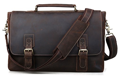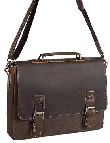 -. Feature : Dimensions: 15.3" x 3.3" x 9.8"; You can take Tablet PC, A4 magazine, portable textbooks, clothing, wallet, phone to Cool Good Finish briefcase Bag / 100% First layer cattle leather briefcase; Antique brass hardware, will not get rusty and have longer using-life / Large Space: Fits most 14" laptops. Inside has a large divider zipper pocket, and 2 open pockets for small items / Reinforced top-handle; Adjustable/ detachable shoulder strap which is made of leather and canvas, with comfortable shoulder pad / Simple classical style; Generally use for business, work and travel; as laptop bag, briefcase handbag, messenger bag