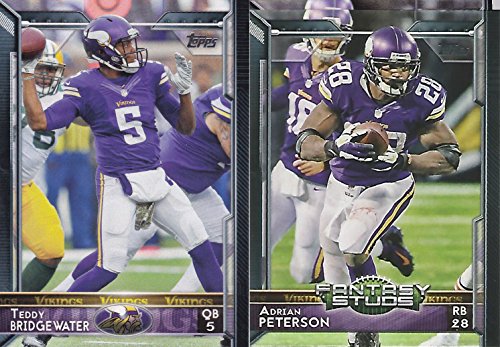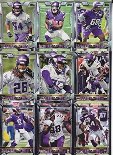 Minnesota Vikings 2015 Topps complete regular issue 16 card team set including 3 different Adrian Peterson cards (regular card #228, Topps 60 #342, Fantasy Studs #329), Teddy Bridgewater, Anthony Barr, Cordarrelle Patterson, Xavier Rhodes, Matt Asiata, Mike Wallace, Jerick McKinnon, Trae Waynes, T.J. Clemmings, Eric Kendricks, Danielle Hunter, Stefon Diggs and a Vikings Team Leaders Card.