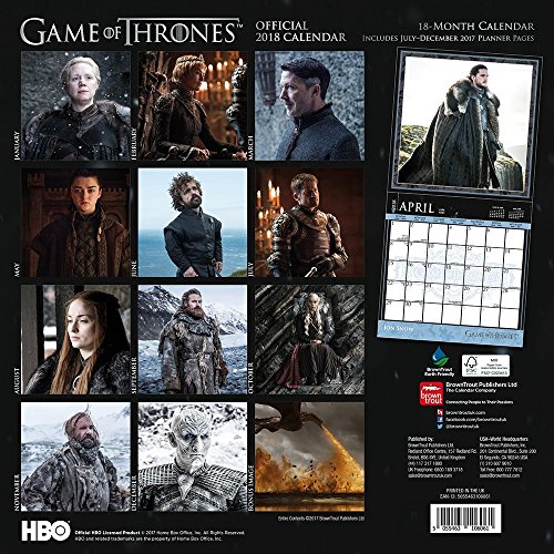 Studio : BrownTrout Publishers Publisher : BrownTrout Publishers Binding : Calendar Product Description Official Game of Thrones 2018 Wall Calendar The Game of Thrones 2018 Wall Calendar features images of one of the most talked-about and celebrated casts on television, including Peter Dinklage, Emilia Clarke, Lena Headey, and more. Summers span decades. Winters can last a lifetime. And the struggle for the Iron Throne has begun. It will stretch from the south - where heat breeds plots, lusts, and intrigues - to the vast and savage eastern lands and all the way to the frozen north, where an 800-foot wall of ice protects the kingdom from the dark forces that lie beyond. Kings and queens, knights and renegades, liars, lords, and honest men...all will play the Game of Thrones, an original series based on George R.R. Martin's best-selling A Song of Ice and Fire series.