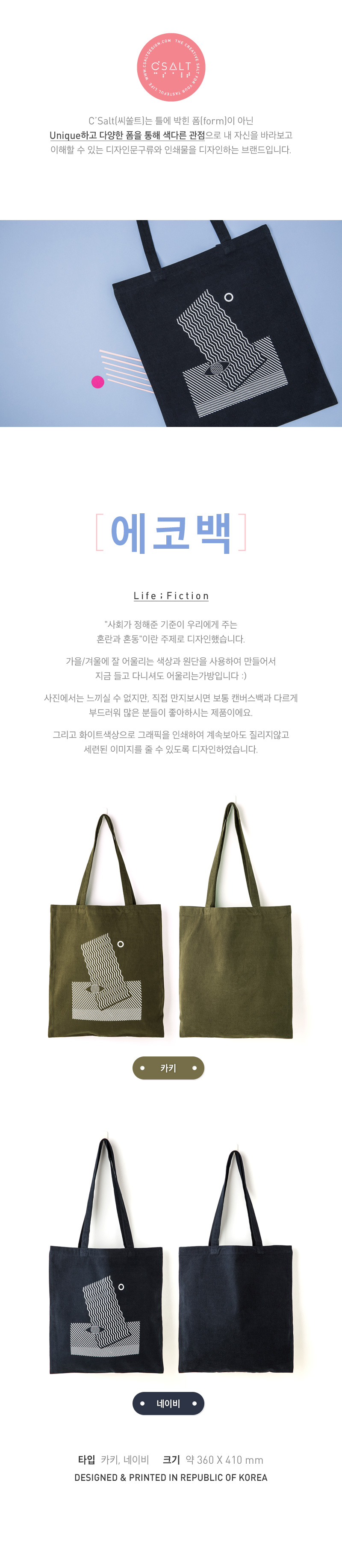 | " L i f e ; F i c t i o n " "사회가 정해준 기준이 우리에게 주는 혼란과 혼동"이란 주제로 디자인했습니다. 가을/겨울에 잘어울리는 색상과 원단을 사용하여 만들어서 지금 들고 다니셔도 계절과 잘 어울리는 가방입니다 :) 사진으로는 느끼실 수 없지만, 직접 만져보시면 보통 캔버스백과 다르게 부드러워 많은 분들이 좋아하시는 제품이에요. 그리고 화이트 색상으로 그래픽을 인쇄하여 계속 보아도 질리지 않고, 세련된 이미지를 줄 수 있도록 디자인되었습니다. 타입: 카키, 네이비 크기: 약 360 x 410 mm DESIGNED & P.R.INTED IN REPUBLIC OF KOREA. * 색상은 모니터와 상황에 따라서 차이가 있을 수 있습니다. C’Salt(씨쏠트)는 틀에 박힌 폼(form)이 익숙하면서도, unique한 폼(form)을 통해 색다른 관점으로 내 자신을 바라보고 이해할 수 있는 디자인 문구류와 인쇄물을 디자인하는 브랜드입니다. |