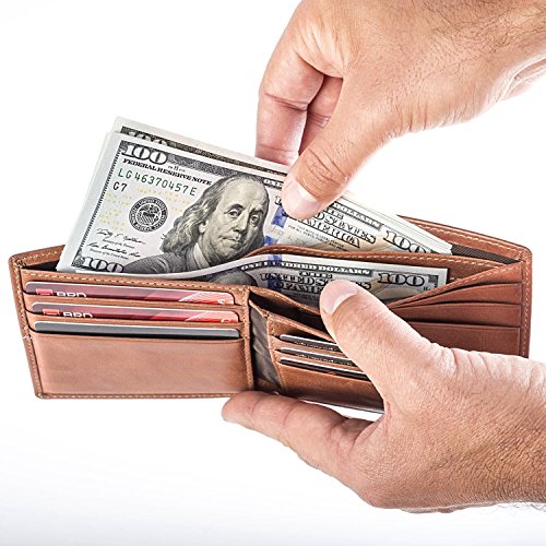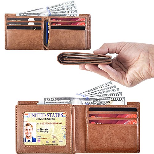 Product Description Genuine Leather RFID BLOCKING Slim Men's Wallet Compact Size: L 4.4' x W 3.5' x H 0.5' - 9 Card slots - 3 Hidden pockets - 2 Bill Compartments - 1 ID window - 1 Easy access card slots Men's Bifold Wallet 100% Genuine Leather HAND MADE Bifold Wallet Package Includes: 1 - Men's Wallet 1 - Luxury Box 1 - Key Holder 0