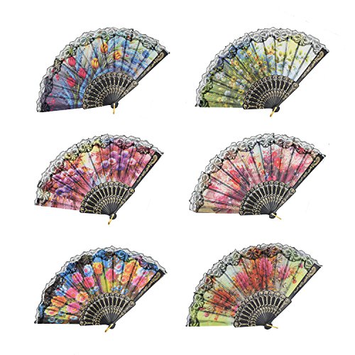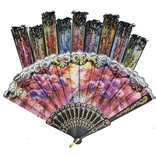 10 Pack Vintage Spanish Floral Folding Hand Fan Sequin Fabric Folding Handheld Hand Fan, Random Color