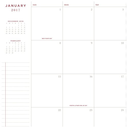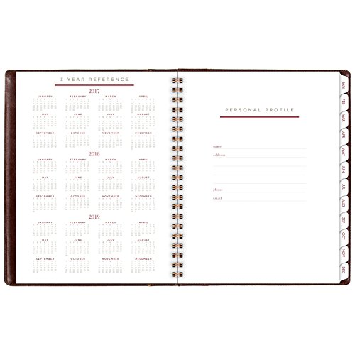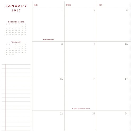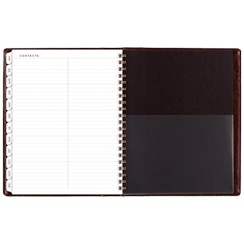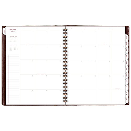-. Feature : 2017 monthly planner covers 13 months from January - January; months are tabbed for easy navigation to any date within the planner; 8-3/4" x 11" page size / One month per two page spread is spacious with unruled daily blocks to easily record important reminders and mark key dates; additional notes space also included on each monthly spread; tan covers of the planner are wirebound with brown accent / Special pages included: holiday listing, 3 year reference calendars, event calendar, contacts pages and notes pages; double-sided clear pocket provides convenient storage for loose sheets / Monthly planner is P.R.Inted on quality paper containing a minimum of 60% post-consumer waste recycled material; Part of the AT-A-GLANCE Collection line of products; mix and match with other items from the line to meet all your planning and organizing needs
