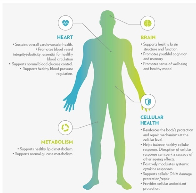Vitamin D3 (as cholecalciferol), Marine Lipid Concentrate (Omega 3 Fatty Acid, EPA, DHA), Citrus Bioflavonoids, Purple corn (Zea mays L.) cob extract, Alpha Lipoic Acid, Quercetin (from Dimorphandra mollis fruit extract), D-Limonene, Rosemary (Rosmarinus officinalis L.) leaf extract, Resveratrol (from Polygonum cuspidatum root extract), Coenzyme Q10, Lycopene, Astaxanthin (from Haematococcus pluvialis algae extract)