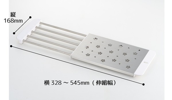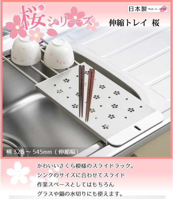 シンクのサイズに合わせてスライド、かわいい桜模様の伸縮トレイ