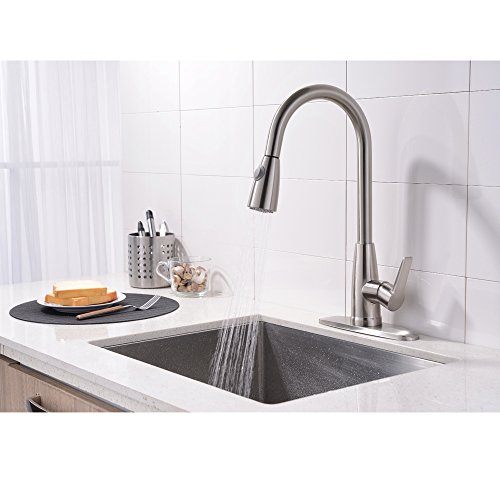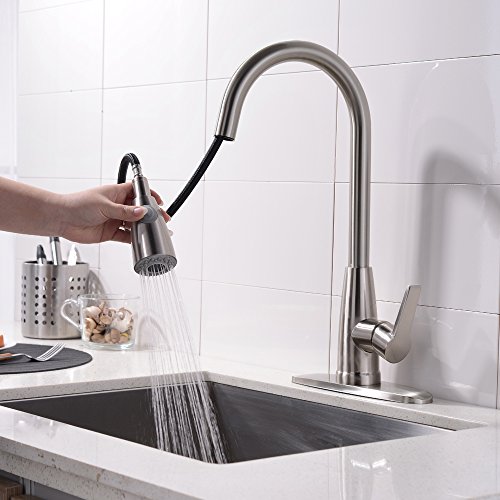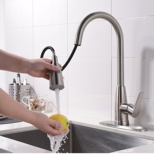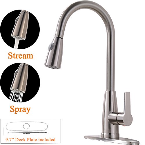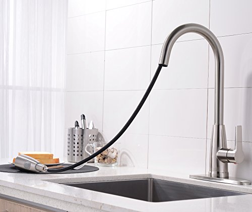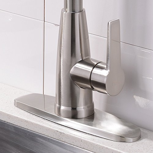 Hotis Modern High Arch Lead-Free Stainless Steel Single Lever Single Handle Prep Sink Pull Down Sprayer Kitchen Sink Faucet,Brushed Nickel Pull Out Sprayer Kitchen Faucet With Deck Plate