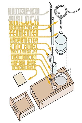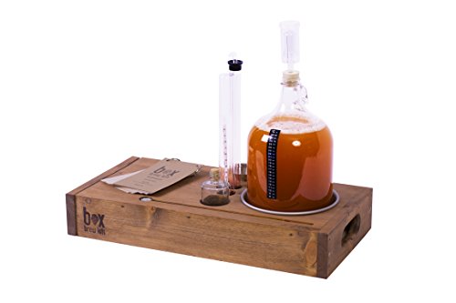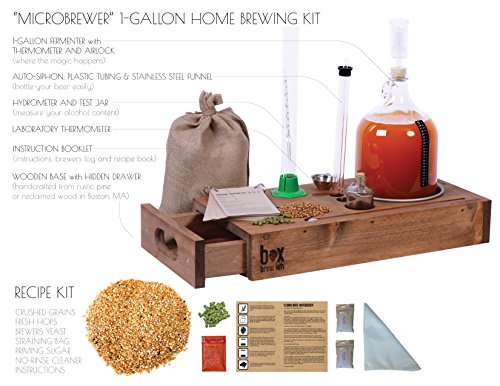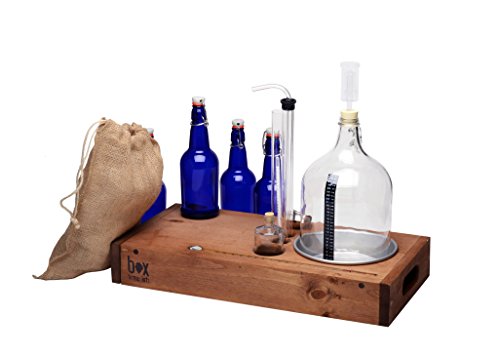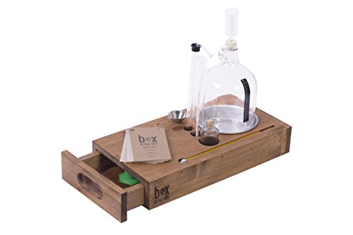 Studio : Box Brew Kits Publisher : Box Brew Kits Product Description Brewing embodies an ancient balance of art and science. From selecting your favorite recipe to drinking the immensely satisfying result, this beautiful handcrafted homebrewing kit contains everything you need to brew delicious craft beer and stir up some great conversation, too. Compact and portable, this model is our smallest. It measures 10 inches; wide x 20 inches; long, easily fitting in even the smallest apartment. From start to finish, the brewing process takes as little as three weeks and will create 8-10 tasty beers for you and your friends to enjoy. One of the sides pulls out to reveal a secret drawer to store any additional accessories. Parts Included: - Box Brew Kits 1-gallon base, handcrafted from rustic pine - 1 1-gallon glass fermenter - Triple-scale hydrometer with test jar (and stand), for measuring alcohol content - Auto-siphon, for quickly and easily transferring your beer between vessels - 2 inch Stainless Steel Funnel - Drilled rubber stopper - Three-piece plastic airlock - Laboratory Thermometer - Miscellaneous glass jar (for priming sugar, sanitizer, etc.) - 4 foot length of 3/8 inch tubing, for siphoning your beer - Recipe Book with over 25 recipes to choose from - Brewers Log - Full set of instructions *Note - this model does not include bottles to bottle your beer. We also offer a Brew Caddy which includes eight cobalt blue flip-top bottles, but there are a number of other options available to bottle your beer, including using plain old soda bottles. Recipe packs are not included and are available for separate purchase. 0