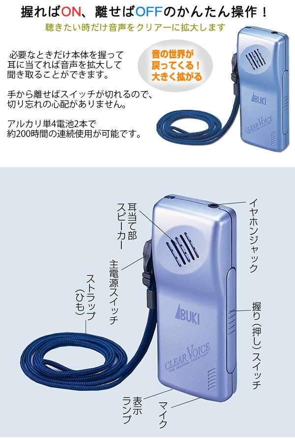 握ればON、離せばOFFのスイッチで切り忘れの心配がなく、聞きたいときに本体を耳に当てれば音声を拡大してくれます。コンパクトなてのひらサイズ。長時間使用には、付属の音量調節付イヤホンのご利用がとても便利です。 |