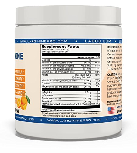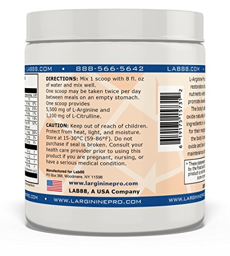Studio : L-arginine Pro Publisher : L-arginine Pro Binding : Health and Beauty Product Description L-ARGININE PRO POWDER SUPPLEMENT: #1 NEW IMPROVED - BEST FORMULA and BEST TASTE. Fastest growing l-arginine powder! Cardio Fitness Health, Increase Energy, Strength Muscle Tone Boost Athletic Performance Increase Anti Aging Immune Function Benefits. Manufactured in one of America's largest labs - government (FDA) inspected and approved. Delivers vital amino acids, nitric oxides. Gluten-Free Formula. L-ARGININE PRO: Cardio Health Nitric Oxide Booster. An affordable alternative to the expensive products first introduced by network marketing companies. our company decided to use only the very best ingredients. We wanted to do more than make a similar product at a better price. We chose instead to make what we believe to be a superior product at a superior price. Because of that commitment, we buy only the highest-grade ingredients. Furthermore, we test the quality and potency of every ingredient. L-ARGININE PRO: is the BEST TASTING and most EFFECTIVE L-Arginine product on the Market! L-arginine Pro is designed to be used to support your blood pressure, cholesterol, heart health while also helping to improve blood flow and increasing energy. HOW DOES L-ARGININE WORK: L-Arginine, an amino acid, is found naturally in foods containing protein such as red meat, poultry, fish, and dairy products. Vegetarians may be at risk for arginine deficiency. The body then converts L-Arginine into a chemical called nitric oxide (NO). Nitric oxide is a neurotransmitter that helps blood vessels to open wider for improved blood flow and circulation. Nitric Oxide has been called the "Miracle Molecule" since 1998 when three American scientists won the Nobel Prize in medicine for uncovering the function Nitric Oxide plays in the body's cardiovascular system. By relaxing and enlarging blood vessels, Nitric Oxide helps control blood pressure, diminish cardio stress, and improve circulation. 0