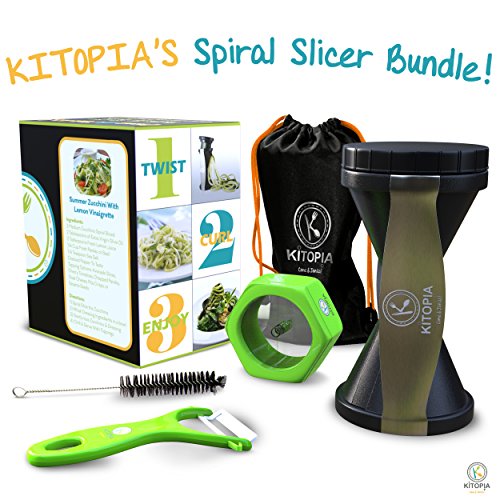 40 Spiral Slicer recipe Ebook. Our detailed eBook provides step by step instructions and will have you performing like a MASTER CHEF in no time! / ★ TEACH YOUR KIDS TO LOVE COOKING: Kitopia's Spiral Slicer Bundle Gift Set will ensure that your kids get excited about helping out in the kitchen. Teach your children a lifelong passion for NUTRITIOUS COOKING. They'll love the exciting and entertaining noodle maker vegetable spiralizer. Watch their eyes light up as they use this vegetable spaghetti maker to make zucchini spaghetti and other delicious dishes the whole family will love. / ★ BRING FUN AND EXCITEMENT BACK TO MEAL TIMES: Now you can use your spiral vegetable slicer as a carrot cutter, potato cutter spiral slicer, zoodle maker ensuring meal times are both entertaining and extremely nutritious. Kids and grownups alike will love the unique shapes and interesting textures you can make with your zucchini spiralizer and cucumber slicer in this exclusive bundle gift set. / ★ DURABLE, VERSATILE AND EASY TO CLEAN: All of the fun and exciting kitchen tools included in the Kitopia Spiral Slicer Bundle Gift Set are made of the highest-quality materials so you and your family can use them for many years to come! We use only top grade stainless steel and high grade BPA plastics in all of our products. Easy to use and even easier to maintain and keep clean. Our storage gift bag enables you to keep all the veggie cutter pieces in one place and the fingers of little ones protected. / ★ THE PERFECT GIFT FOR ALL AGES: Looking to surprise and delight somebody on your gift list? The Kitopia Spiral Slicer Bundle gift set is the perfect gift for everyone from 7 to 107! Delivered in gift quality packaging, it makes a memorable and appreciated gift for any occasion. UNCONDITIONAL MONEY-BACK GUARANTEE: Your purchase is completely backed by our famous no-questions-asked unconditional money-back guarantee. If you are for any reason unsatisfied with your gift bundle, simple return it to us for a full refund. It's that easy!