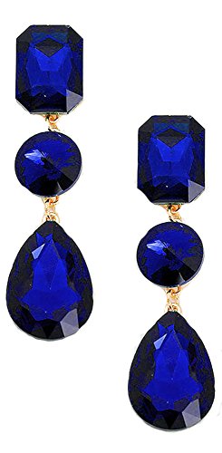 Royal Blue Crystal Rhinestone Dangle Clip On Earrings Accented with Goldtones