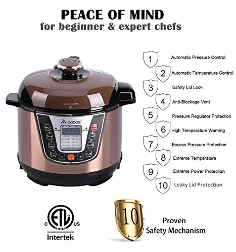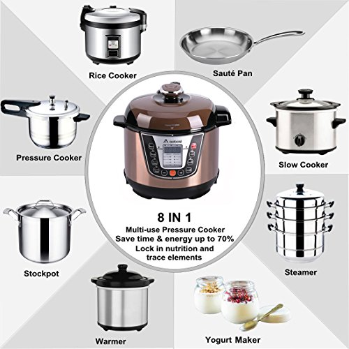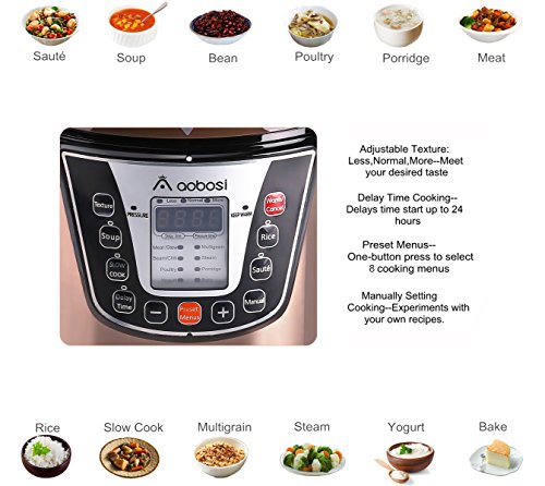 【MULTI-FUNCTIONAL COOKER:】Pressure Cooker, Slow Cooker, Rice Cooker, Steamer,Warmer, Sauté Pan, Yogurt & Stockpot. Make your family meals easily with this Aobosi 8 in1 pressure cooker, greatly reduce stress to cleanup multiple pots and pans after one cooking time.Non-stick cooking pot for efficiently clean up.