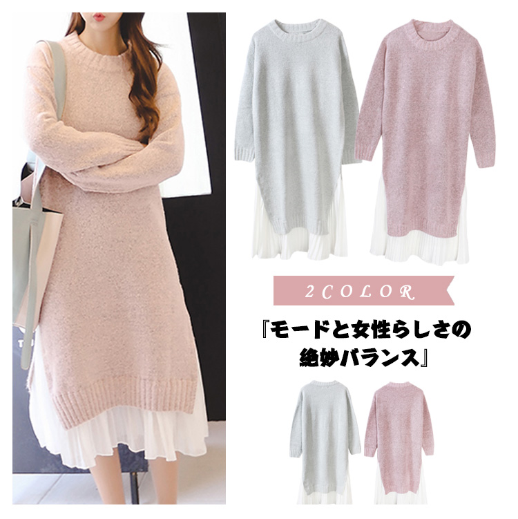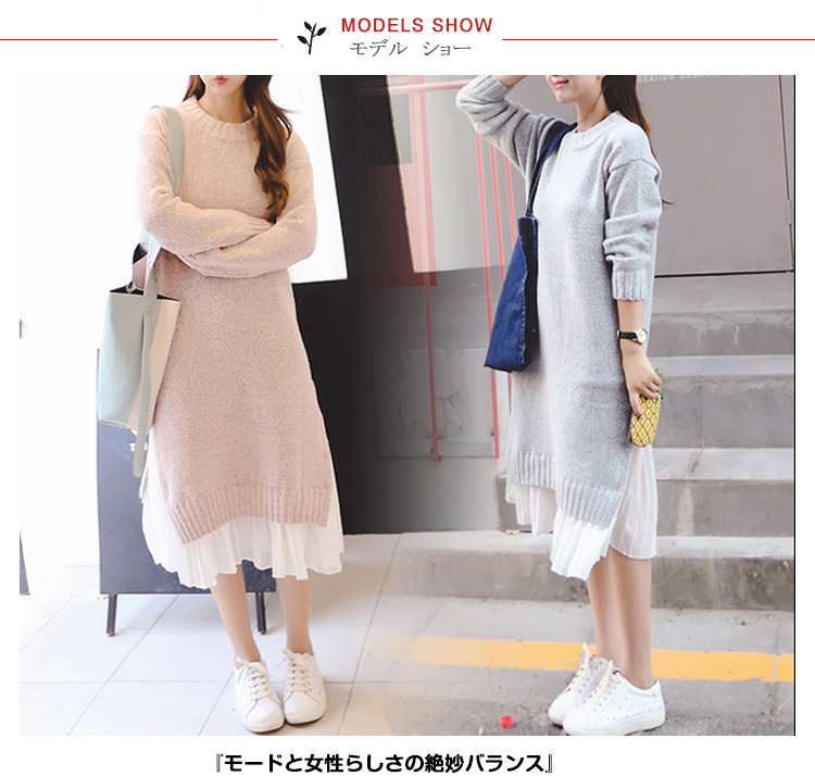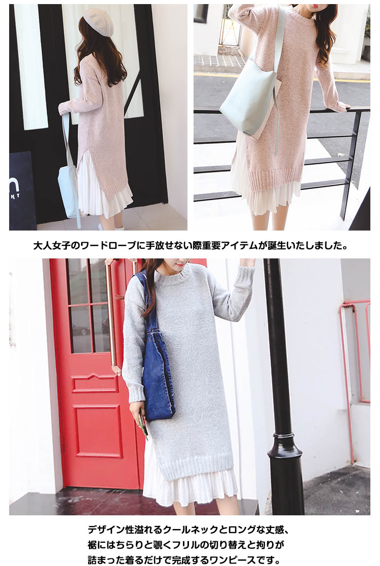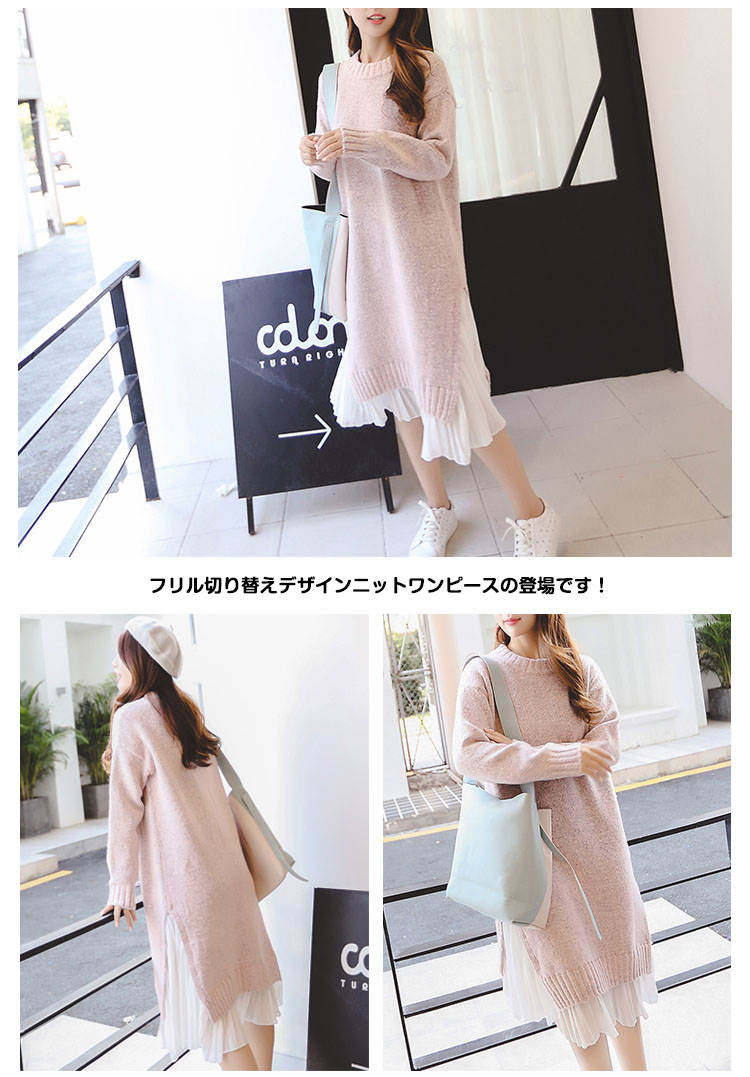 | 『モードと女性らしさの絶妙バランス』フリル切り替えデザインニットワンピースの登場です!大人女子のワードローブに手放せない際重要アイテムが誕生いたしました。デザイン性溢れるクールネックとロングな丈感、裾にはちらりと覗くフリルの切り替えと拘りが詰まった着るだけで完成するワンピースです。忙しい朝や、コーデに迷ったお出かけの日に一枚持っていると便利です! | |