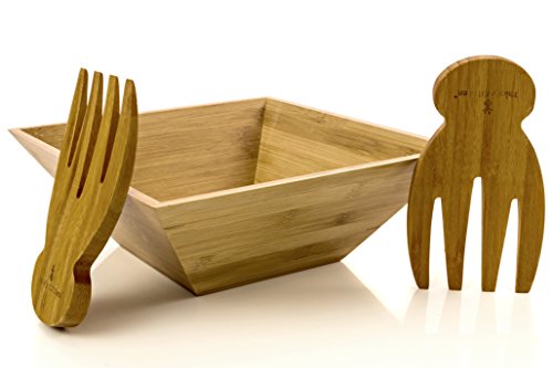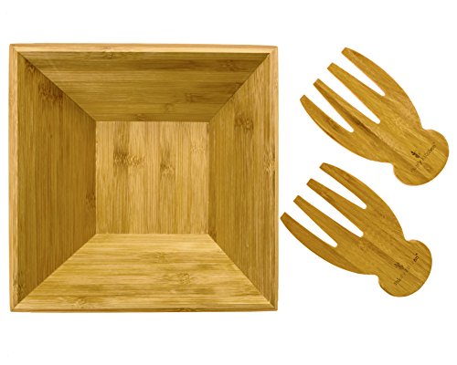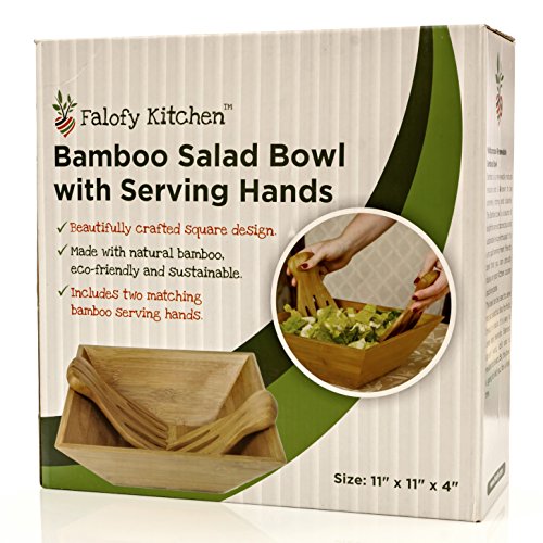 Bamboo Salad Bowl with Serving Hands; Large Eco-Friendly Bamboo Square Bowl with Matching Tosser/Server Claws; Stylish Design which Looks Great On Your Kitchen, By Falofy Kitchen