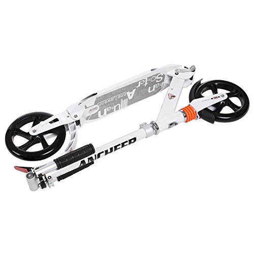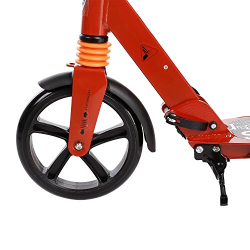 -. Feature : ☛:Safest Brake System---There is a rear mechanical disc brake and a rear anti-lock braking system to keep the safety. / ☛:Foldable---There is no need to assemble, and it's quite easy to fold it up, which saves you a lot of time and much convenient to store and carry. / ☛:Shock-absorbing Design---The rubber wheels, dual suspension and precision ABEC-7 bearings make sure you have a smooth ride and offers you a good user experience. / ☛:Adjustable T Bar---The handbar is made of qualified rubber which is comfortable to grip, and it has 3 level height to adjust from 90-95-100cm/35.1-37.1-39 inch. / ☛:For the Crowd---Great for adults and teenagers(>12 years old), the maximun weight of this scooter is 220lb(100kg).
