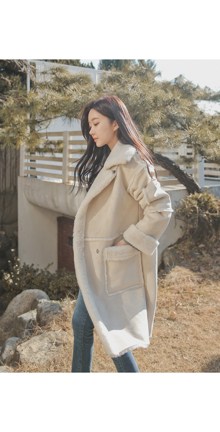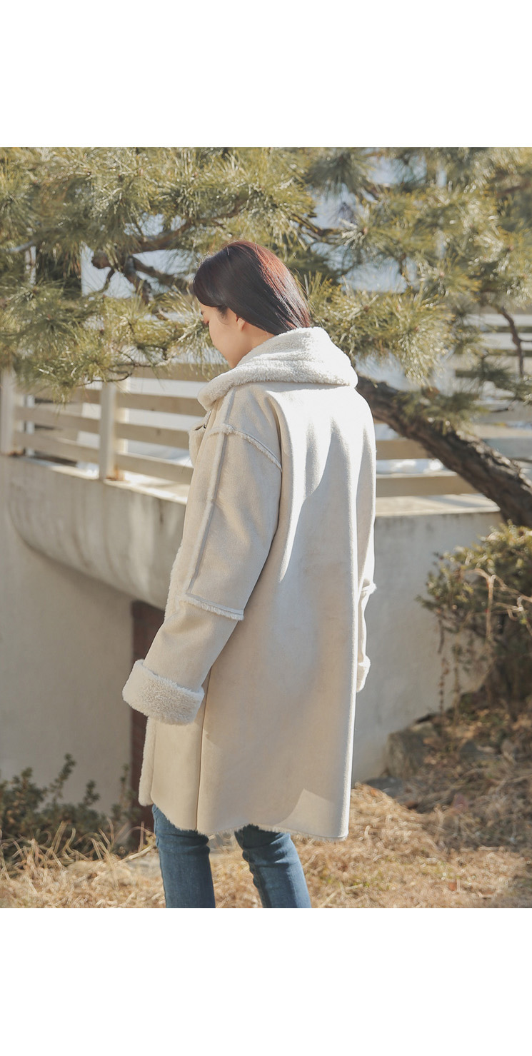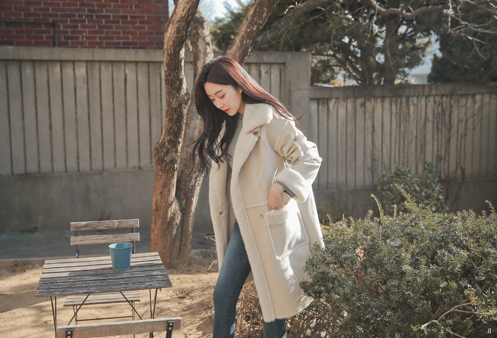 무릎선까지 내려오는 롱 무스탕에 여성스러운 디자인으로