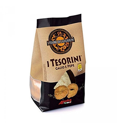 -. Feature : Italian bakery product - cheese and pepper taste / I Tesori di Canusium: I Tesorini Cacio e Pepe * 7.93 Ounce (225gr) Package (Pack of 4) / Great as a snack for your kids or for your daily lunch break / Store in a cool and dry place, not in the refrigerator / Made in Italy