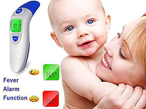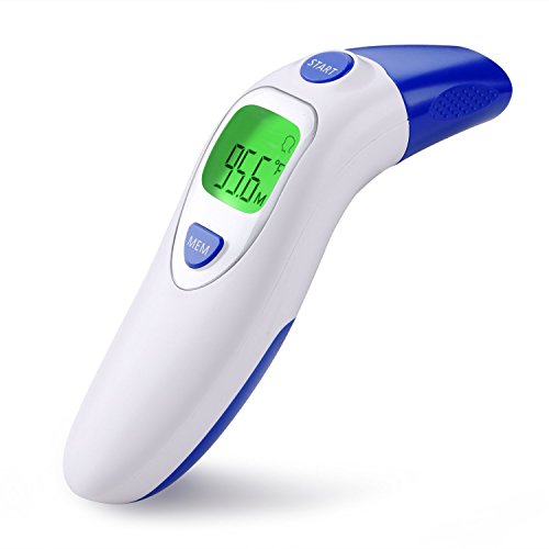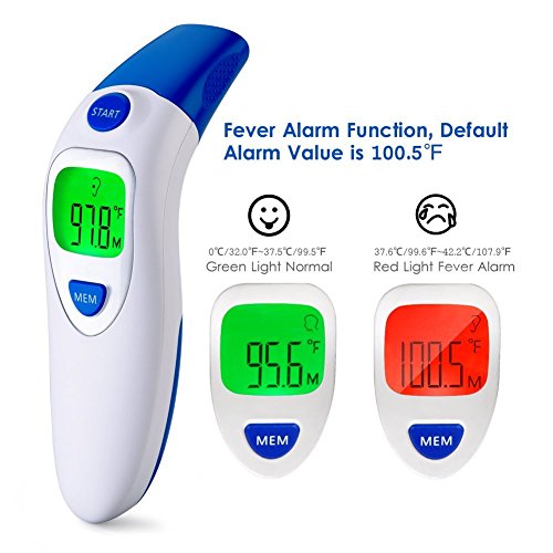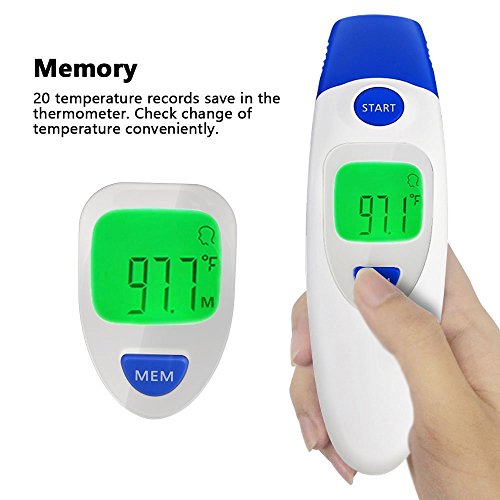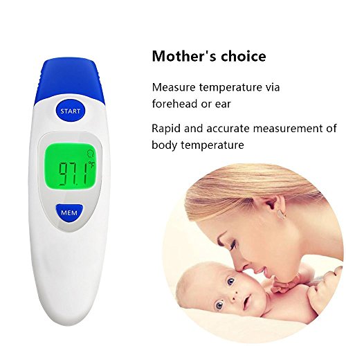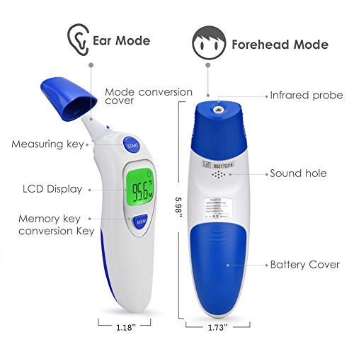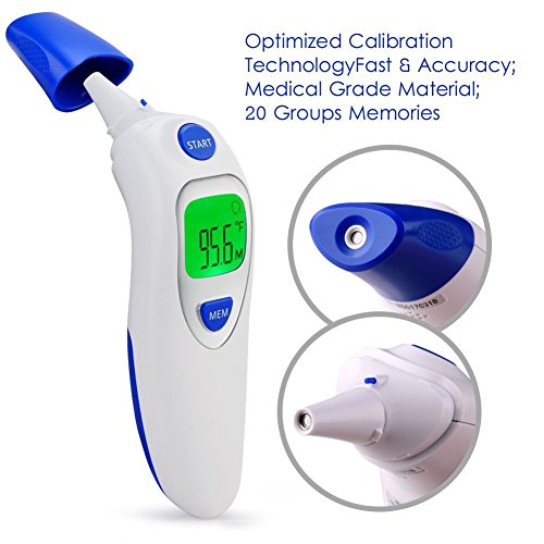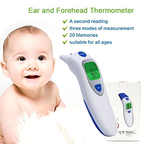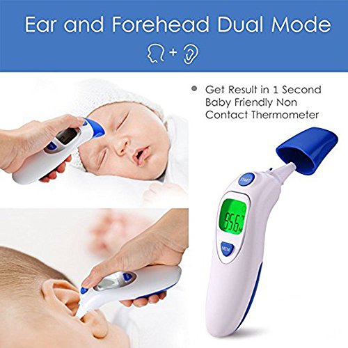 Studio : Aphaca Direct Publisher : Aphaca Direct Binding : Health and Beauty Product Description CE FDA Approved Dual Mode Medical Forehead and Ear Thermometer, Professional Non Contact Electronic Ear Thermometer for Kids Babies Toldders Infant Children Adults Checking Setting 1.Under shutdown mode, Pressure "MEM" button to show "---M" mode to check last 20 groups temperature records. 2.Under shutdown mode, Pressure "MEM" button for 6 seconds until the screen show "---℃" or "---℉", then Press one more time to switch ℃ or ℉ and off after 3 seconds Measure Method: For forehead-contact type 1.Close to the skin of forehead 2. Press start key one time For ear-contact type 1. Take off the mode conversion cover 2. Insert the Probe into the ear canal 3. Press start key one time For object non-contact 1. Take off the mode conversion cover 2. Point to the object 3. Keep the distance about 5mm 4. Press start key one time Specifications: Fever Warning: 38°C/100.4°F or higher Temperature Mode:°C/°F Body Temperature Range: 32°C~42.9°C (89.6°F~ 109.2°F) Surface Temperature Range: 0°C ~ 100.0°C (32.0°F~ 212.0°F) Precision: ± 0.2°C / ± 0.4°F Measuring Distance: 2mm~5mm Quick Reading Time: 1 second Auto-Off: In 30 seconds Power Supply: 2 * 1.5V AAA Batteries(Included) Battery Lifetime: ≥3000 uses Operating Conditions: 16~35°C / 60.8~95°F; ≤85% Storage Conditions: -25~55°C / -13~131°F; ≤90% Package Included: 1*Dual mode Ear/Forehead thermometer 1*User Manual