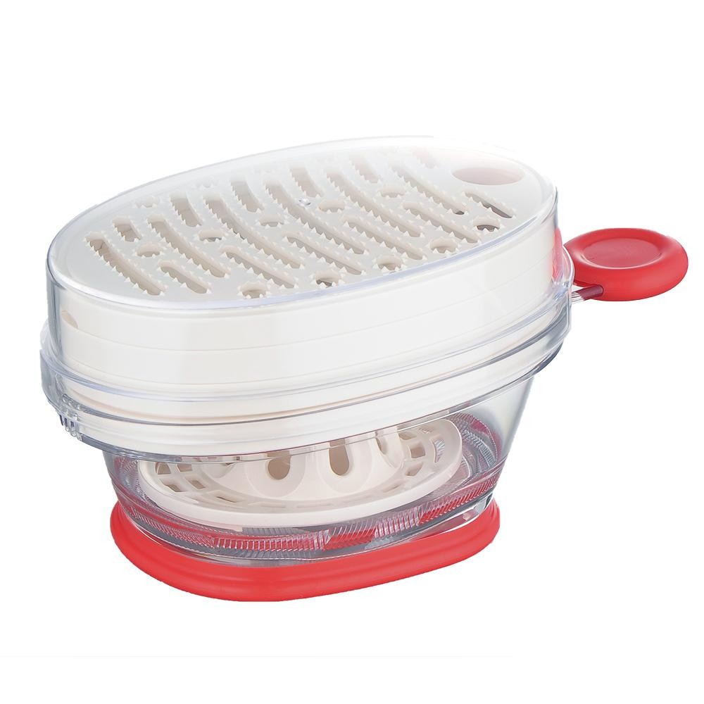 | 素材・材質 | 本体容器・レモン絞り:AS樹脂、蓋:スチロール樹脂 スライサー・千切り・玉子つぶし:ABS樹脂・ステンレススチール おろし・カセットパネル・安全ホルダー:ABS樹脂 本体底すべり止め・本体グリップ:熱可塑性エラストマー |