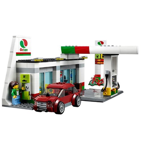 -. Feature : Includes 4 minifigures: a station attendant, mechanic, tow truck driver and a female customer. / Features a 1-story building with 2 different building instructions - either a gas station, with a sign, pumps and kiosk or a service station with lift, mail stand and separate wash station. / Includes building possibilities for 6 different vehicles. / Tow the car to the gas station with the tow truck. / Accessory elements include a hammer, wrench, broom, shovel, 2 bins and a bicycle.